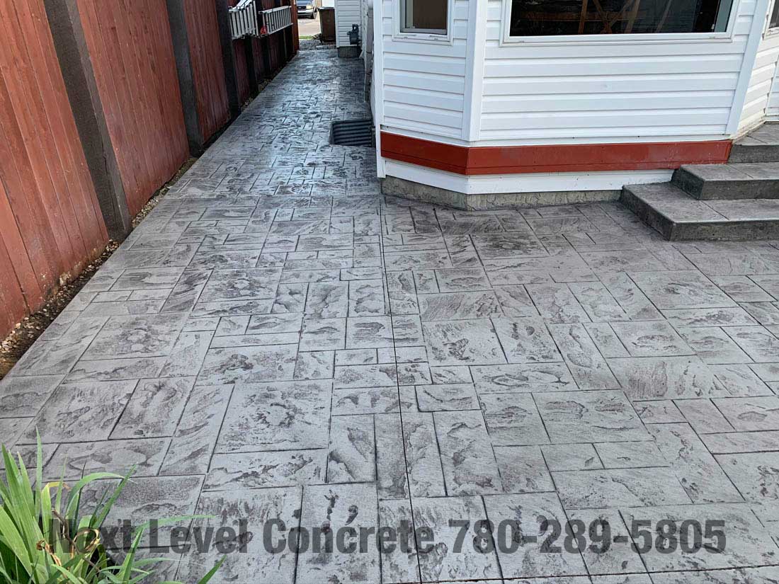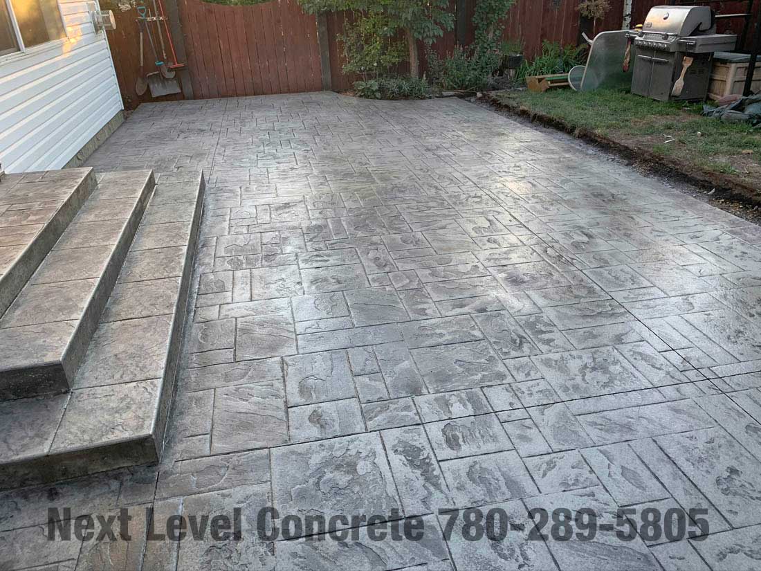 Client wanted to clean up his yard of patio stones that become uneven and weed ridden. He chose this ashlar slate stamped grey concrete patio with a steps and is really happy with the result.