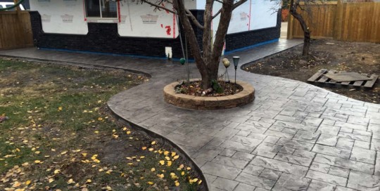 staffStamped concrete patio in Edmonton butted up against a large stone and foundation wall.